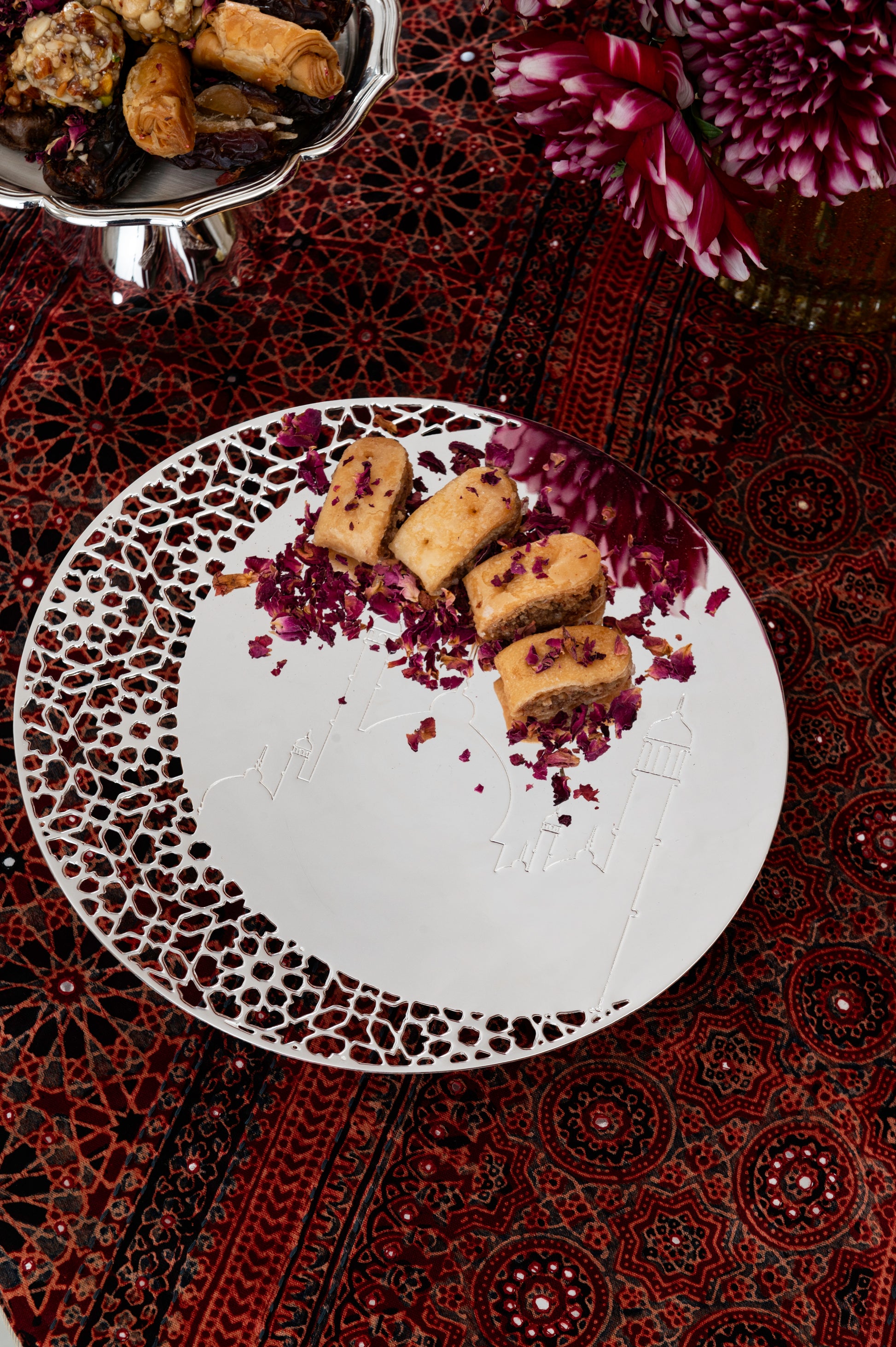 With its delicate lace detailing, Along with a beautifully etched traditional arabic pattern, This platter makes for a great gift for your friends and family. Comes with a Jade stone base. Fill it up with gourmet sweets and give away in style.