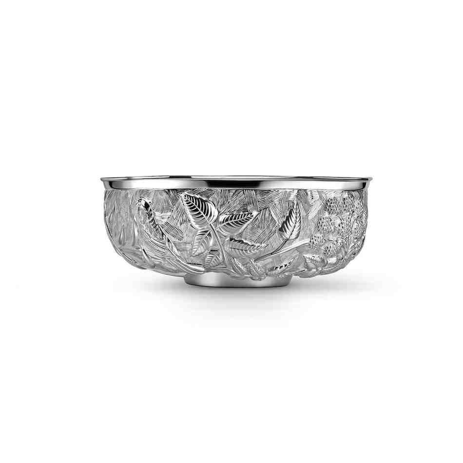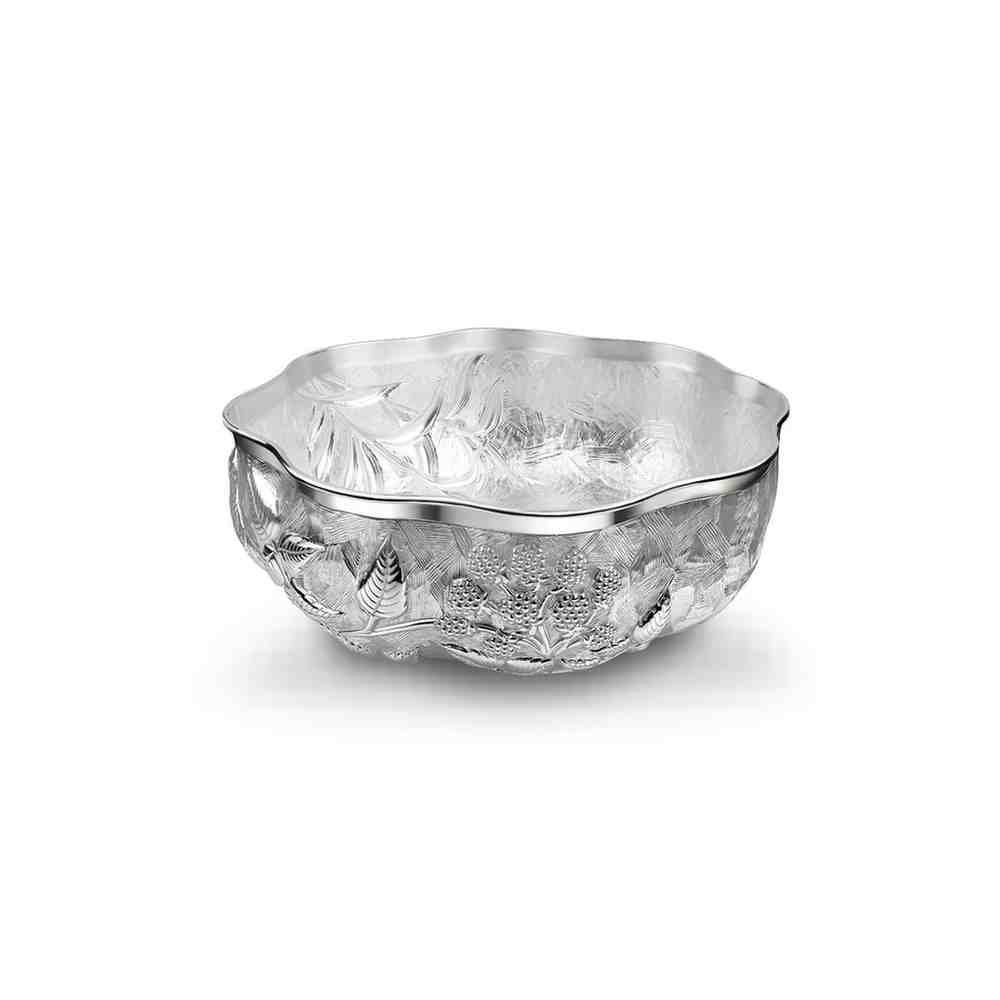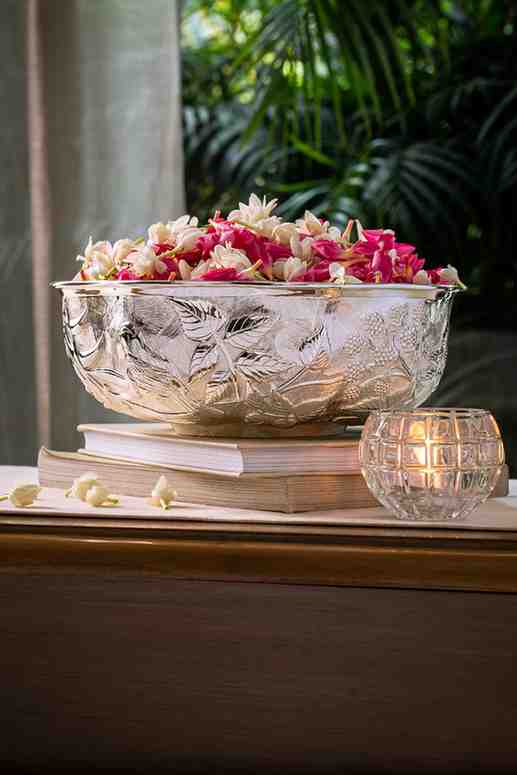The round urli bowl adorned with hand chased birds and berries, is a statement addition in your living space and looks beautiful filled with floating candles or dried foliage.