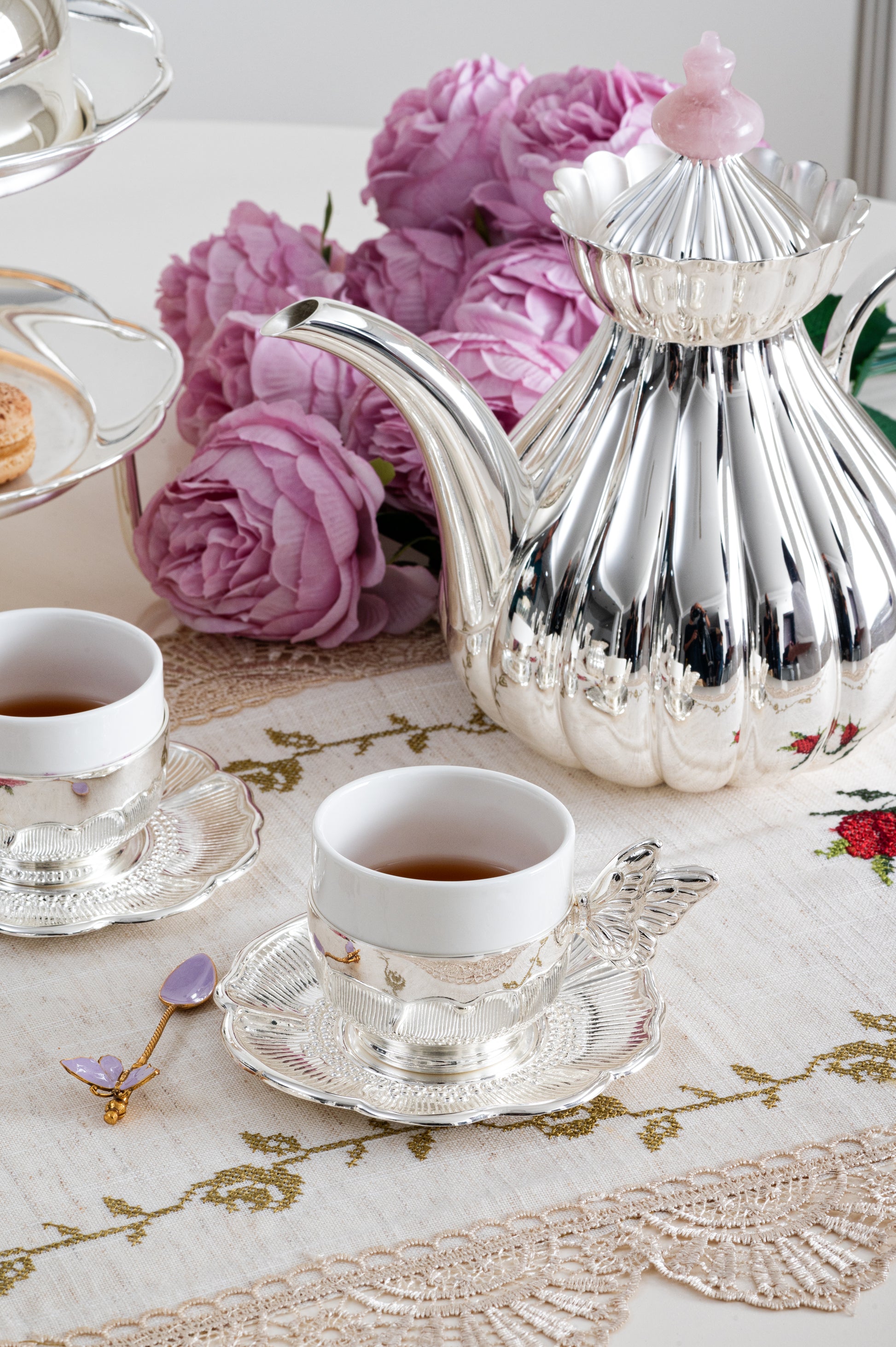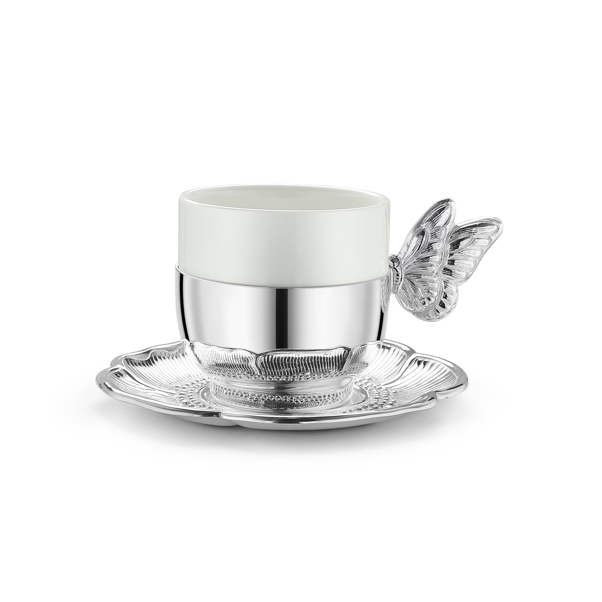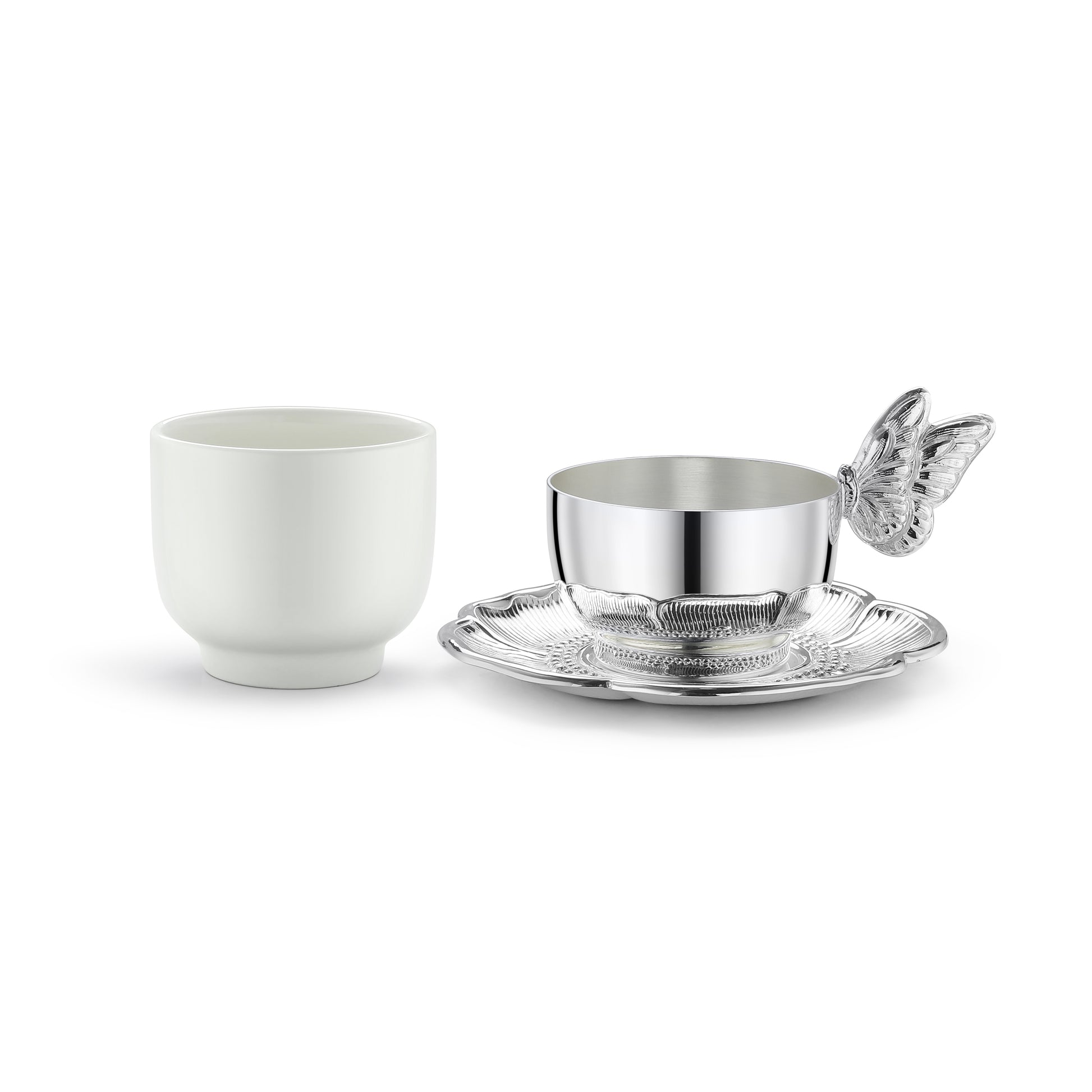 - Scalloped saucer base and butterfly accent blend practicality with charm.