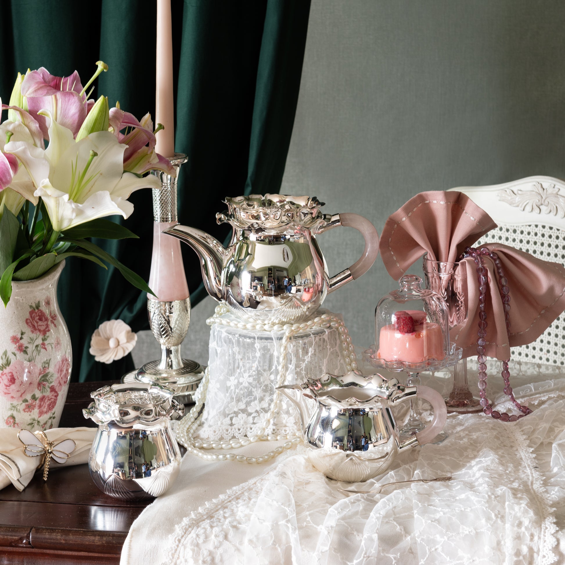 Inspired by the cabbage rose this tea set is painstakingly crafted and our founders favourite. The set is meant to be kept on full display when not in use to admire its unique design and craft. Details : includes teapot, sugar pot and milk jug. Teapot capacity is 1.1 litre. Hand wash. It comes with rose quartz stone handles.