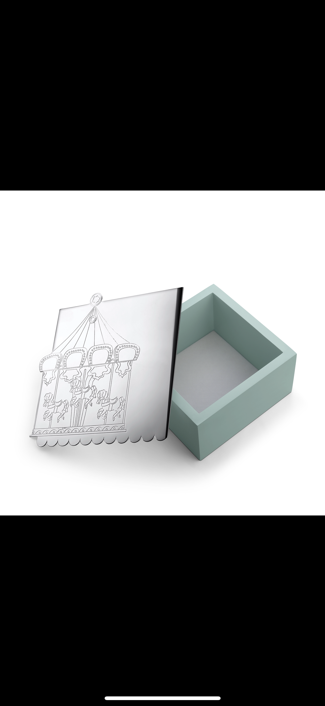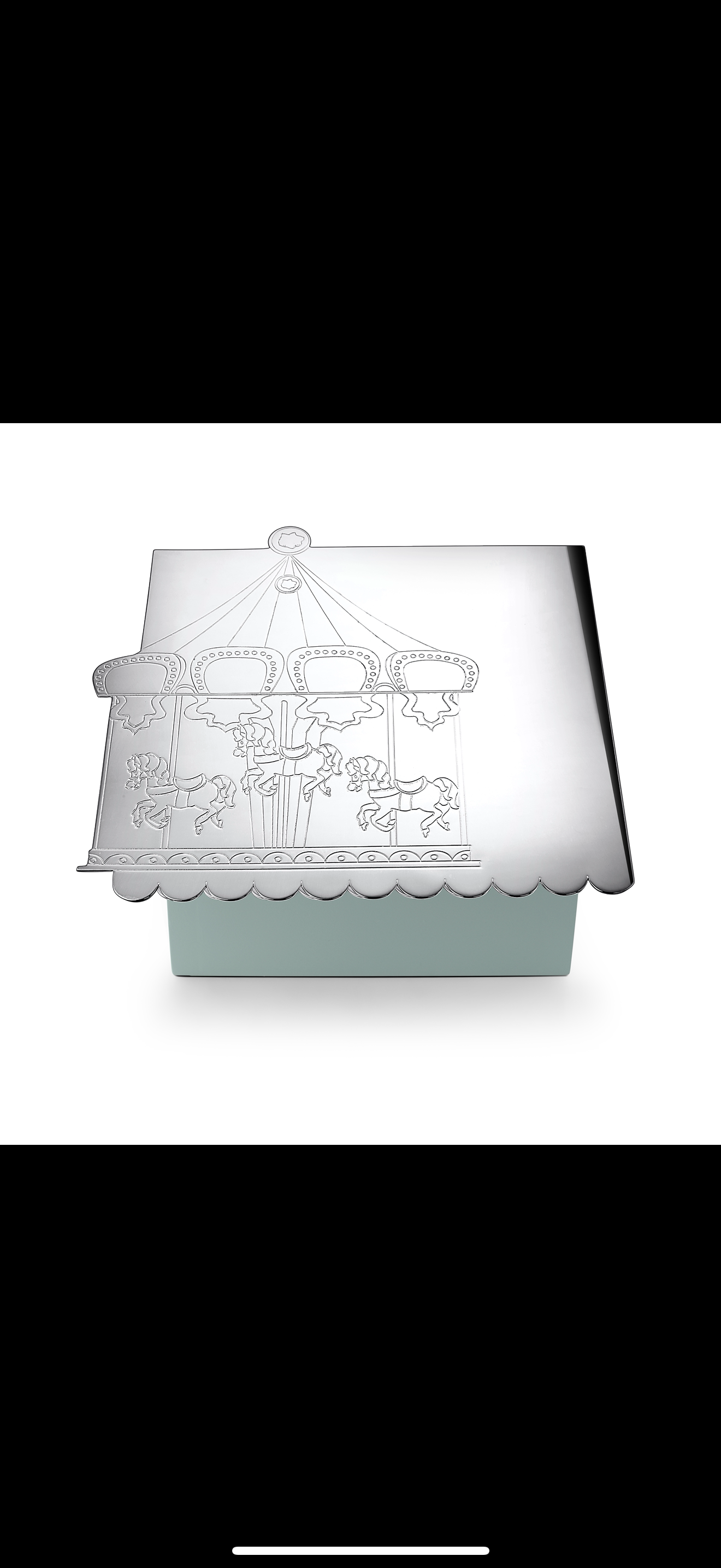 Whimsical silver gift box with a carved carousel motif, perfect for newborn giveaways.