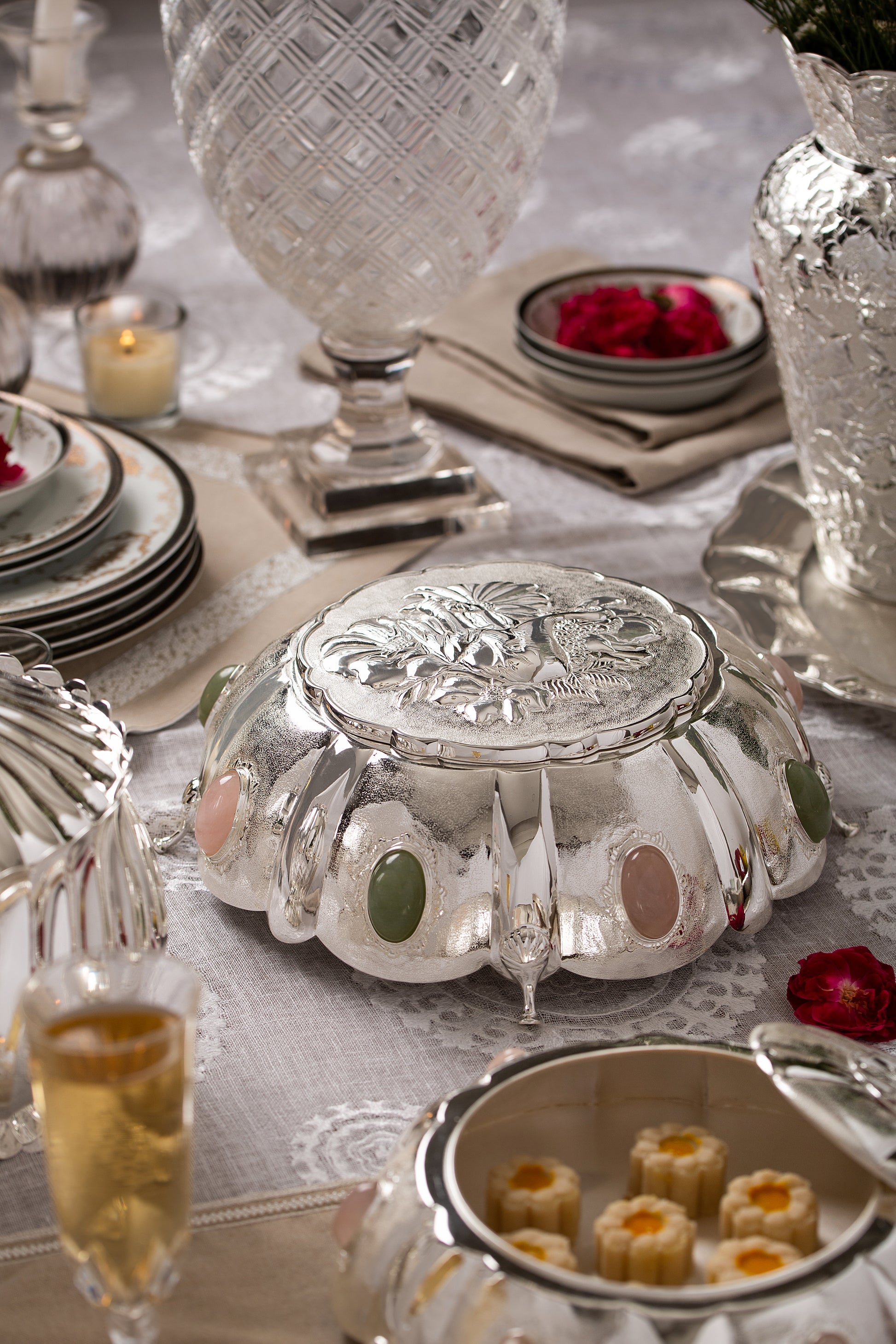 This box, crafted under the eye of the country’s most skilled craftsman, is a rare to find piece of art. It features an intricate hand chased elephant on the lid and is accented with rich precious stones. It is perfect to be kept on the coffee table, storing your treasured possessions, or on the dining table to serve those bite sized desserts to your guests.