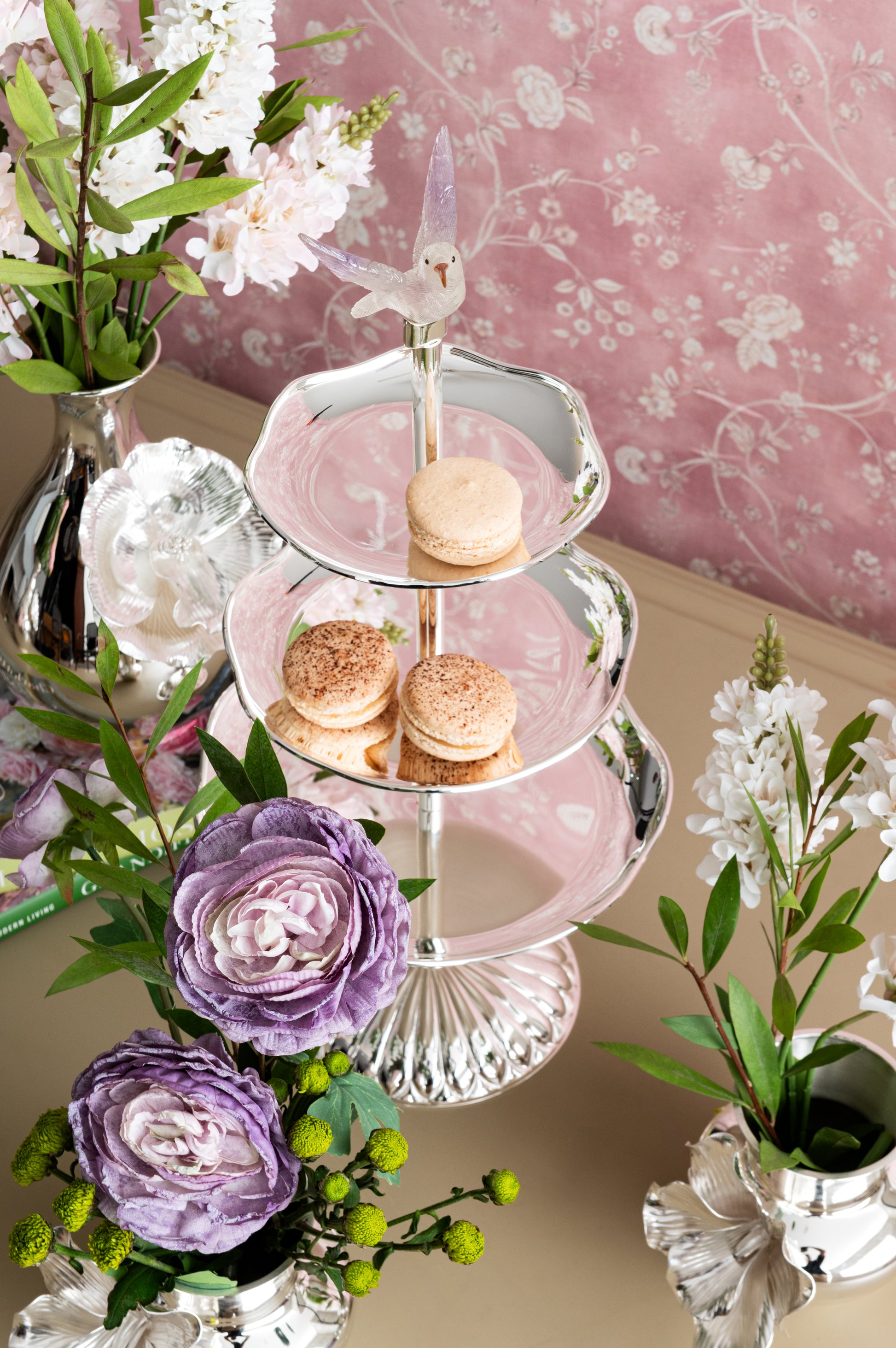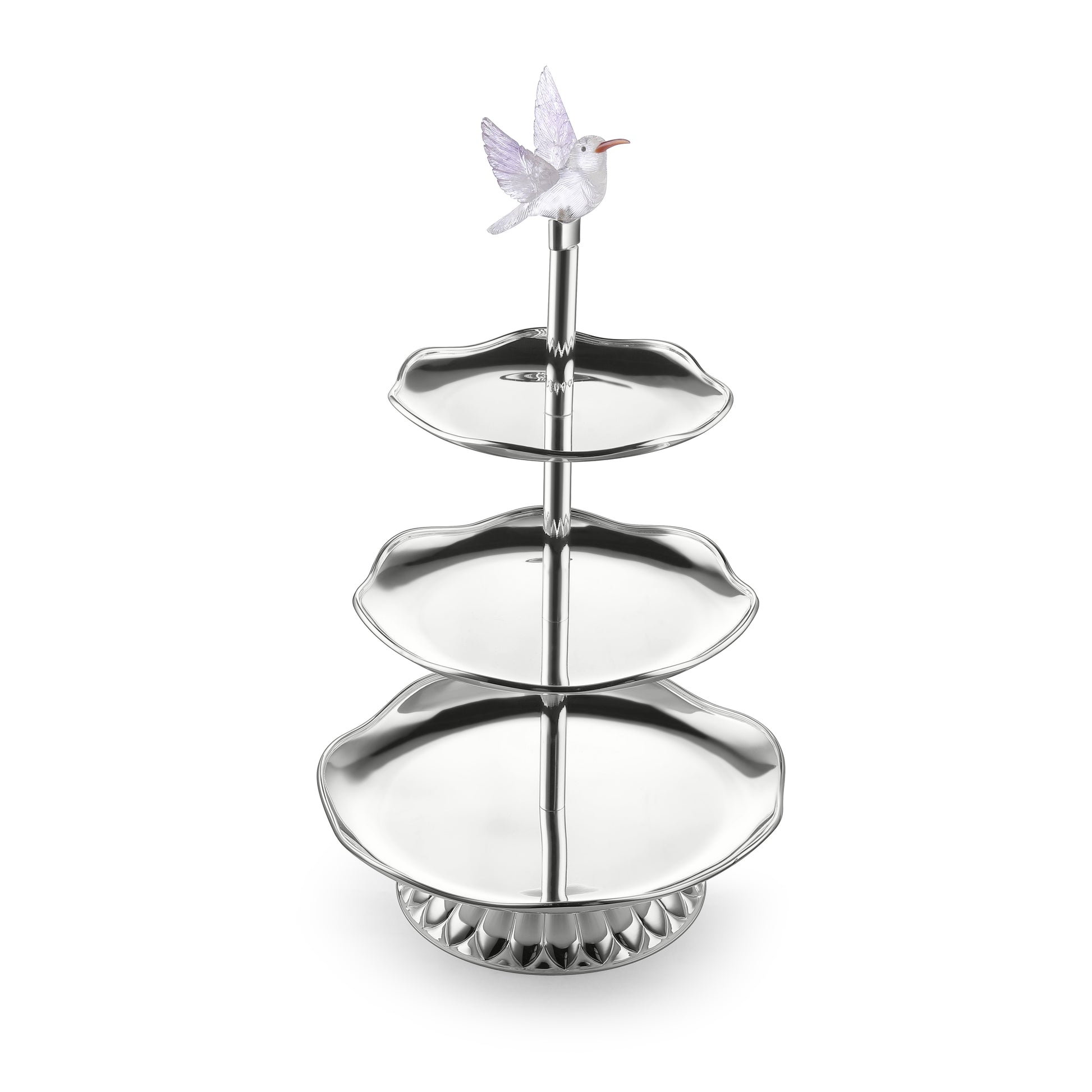 - A silver-plated three-tiered stand with scalloped-edge trays , crowned by a delicate quartz hummingbird