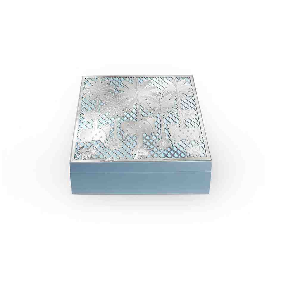 This wooden box decorated with a silver plated pichwai jaali makes for a great wedding giveaway and can be ordered with customized acrylic partitions for large orders.