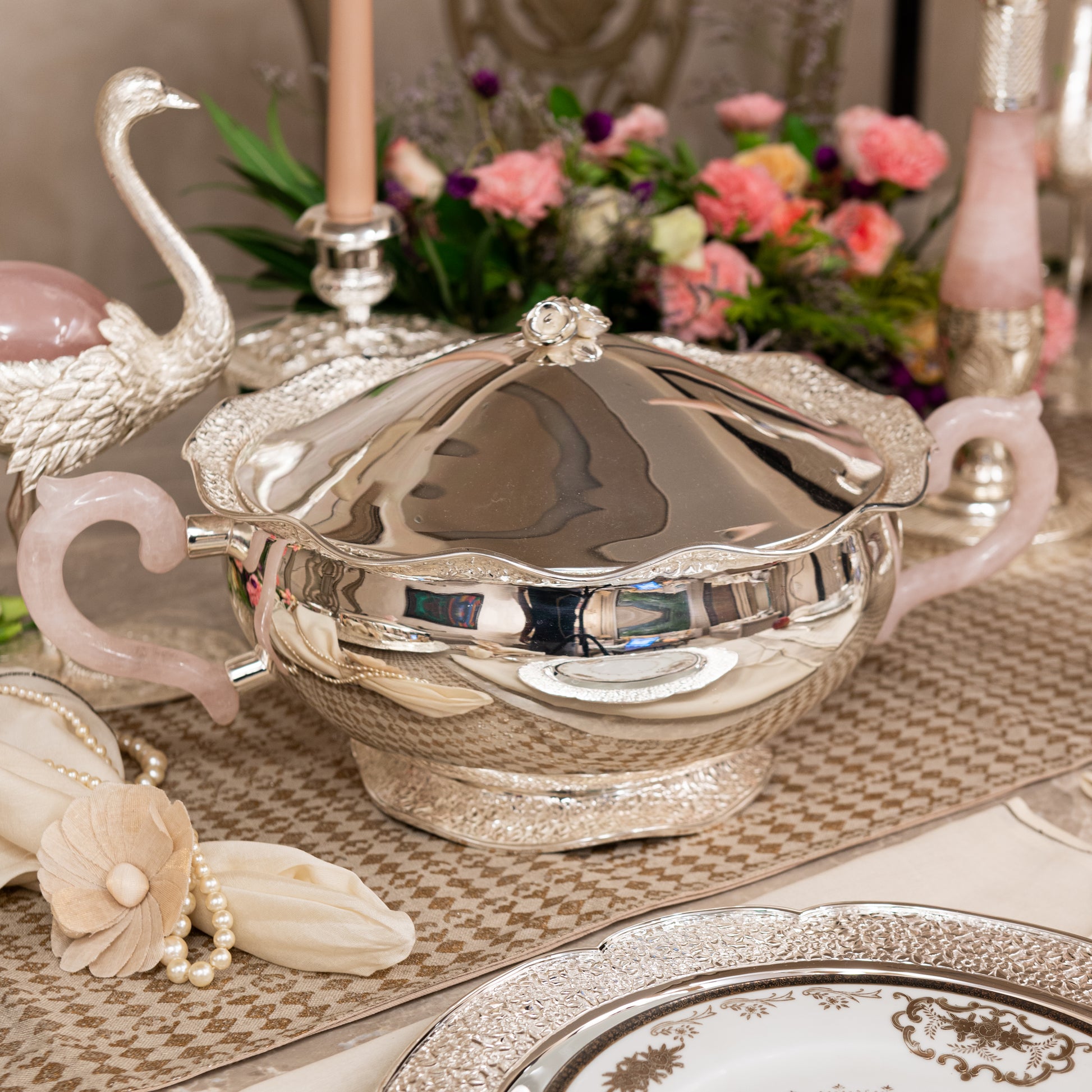 A testament to the brands exceptional craftsmanship, the rosa handi dish is set to impress at your next dinner party. Accented with rose quartz handles and handcrafted roses on the dish ,it promises to bring luxury opulence to your table.