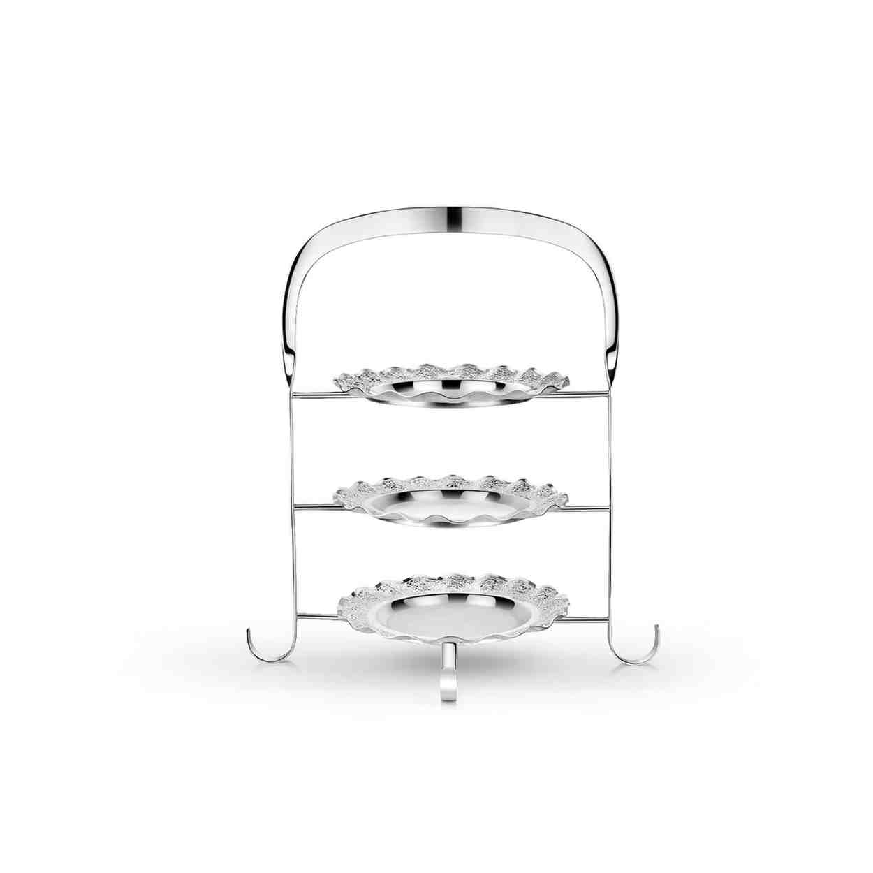 Delight your guests by presenting them with fruits, finger sandwiches and pastries served on this elegant three tier stand. This delicate high tea stand comes with three plates accented with ruffled edges and floral carving.