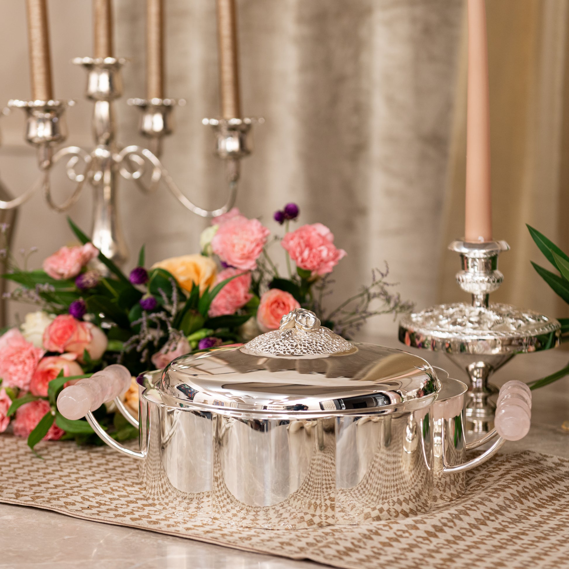 Make dinner an exquisite occassion with this intricately detailed serving dish. With its rose quartz handles and handcrafted roses as knobs. This covered vegetable dish is sure to impress your guests. Comes with a glass bowl inside for easy cleaning and maintenance. Details : capacity is 1.4 litres. Comes with a glass dish insert. Rose quartz stone handles.