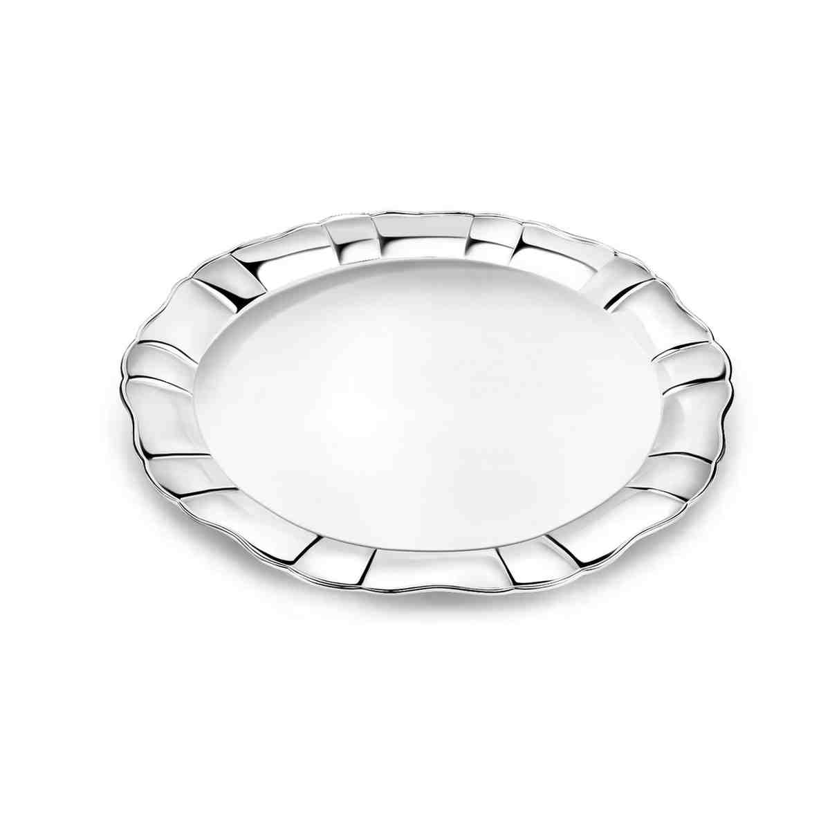 This large circular tray with a hand chased border is ideal for beverage service or tray passed appetizers at an event.