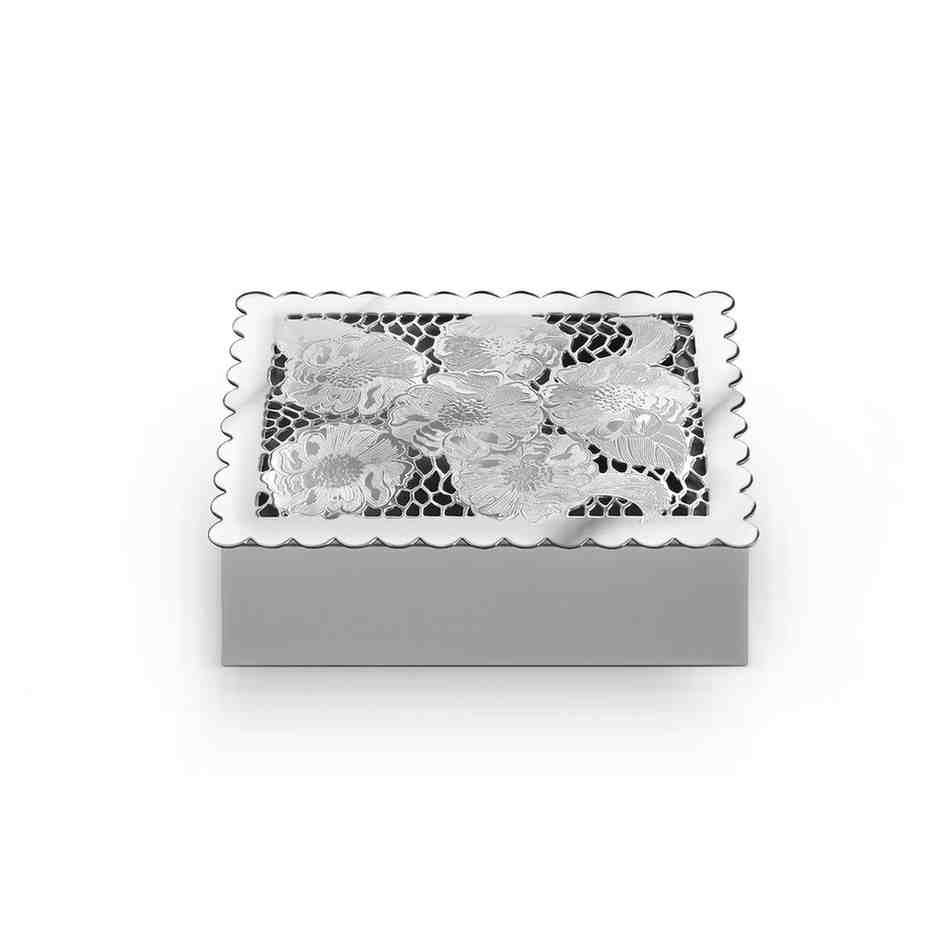 Crafted with a wooden base and a scallop border lid, this box is a cute accessory for any vanity table. It makes for a great wedding/newborn giveaway.