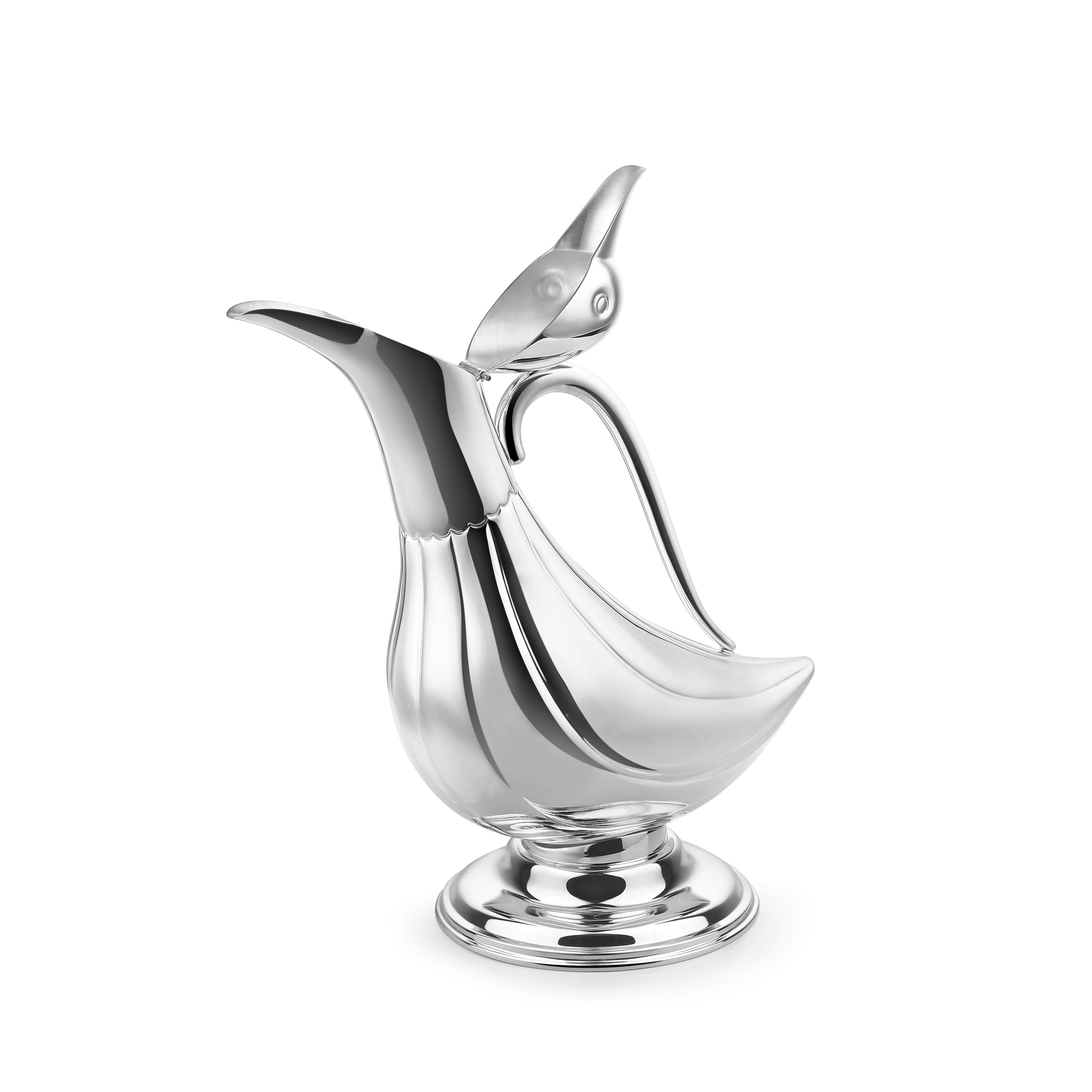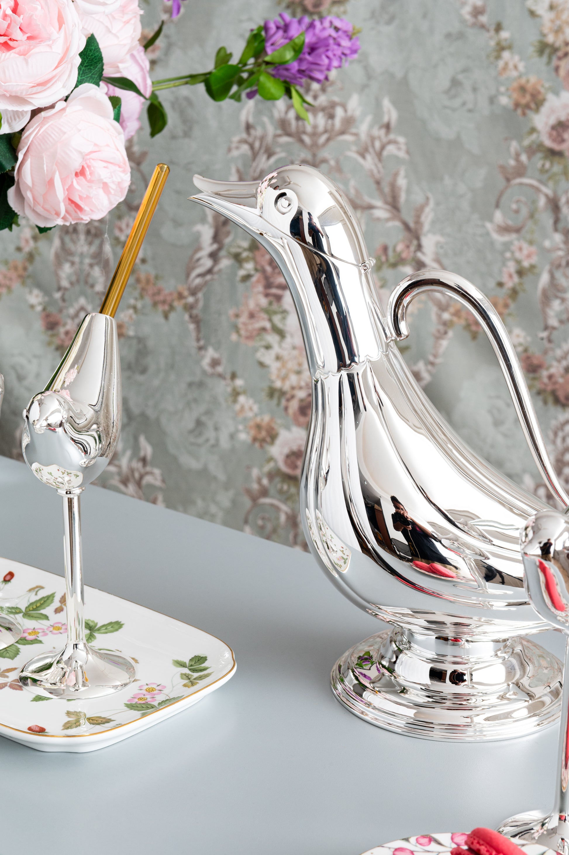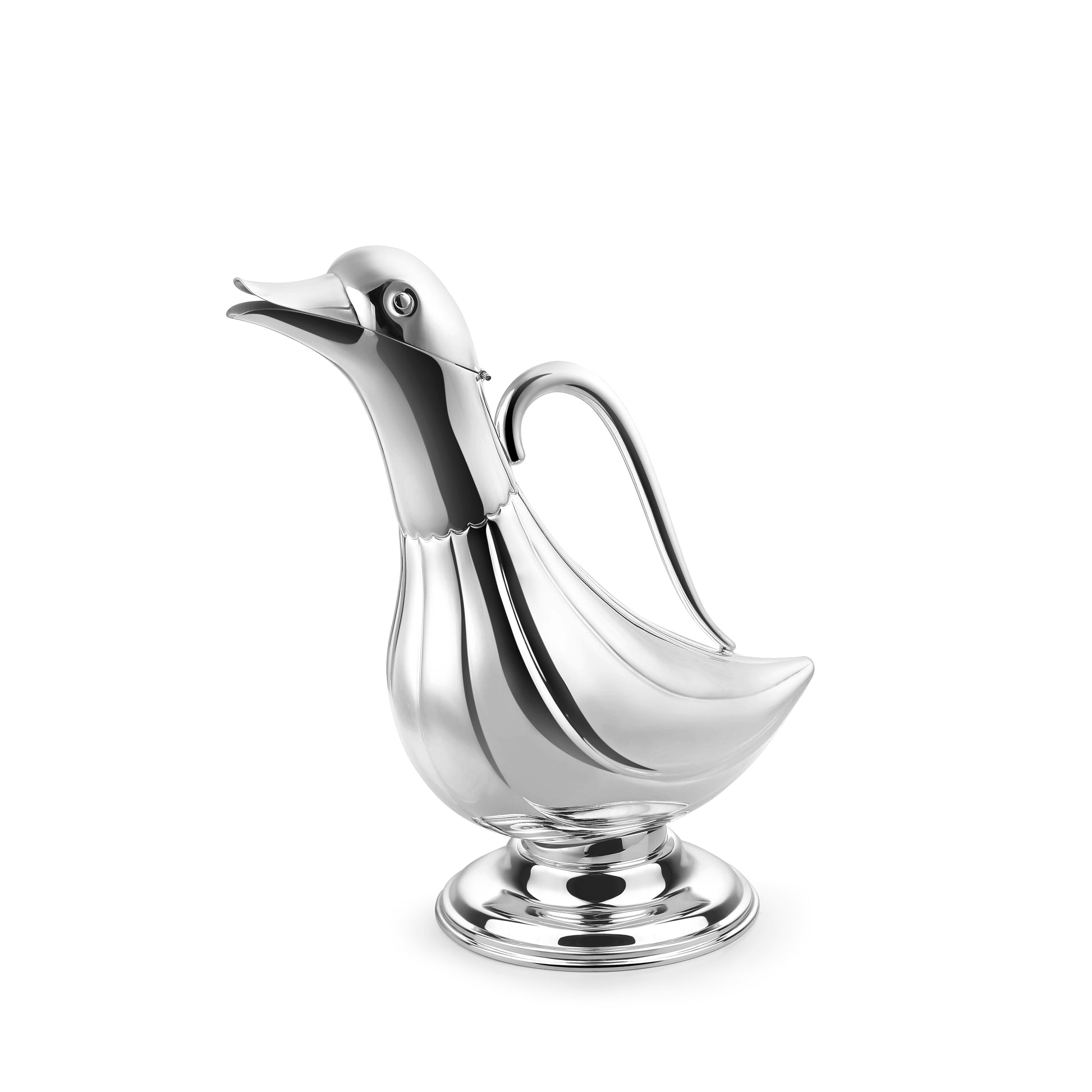 - A charming silver-plated jug and wine decanter shaped like a graceful duck, complete with a hinged head–lid for easy filling and serving.
