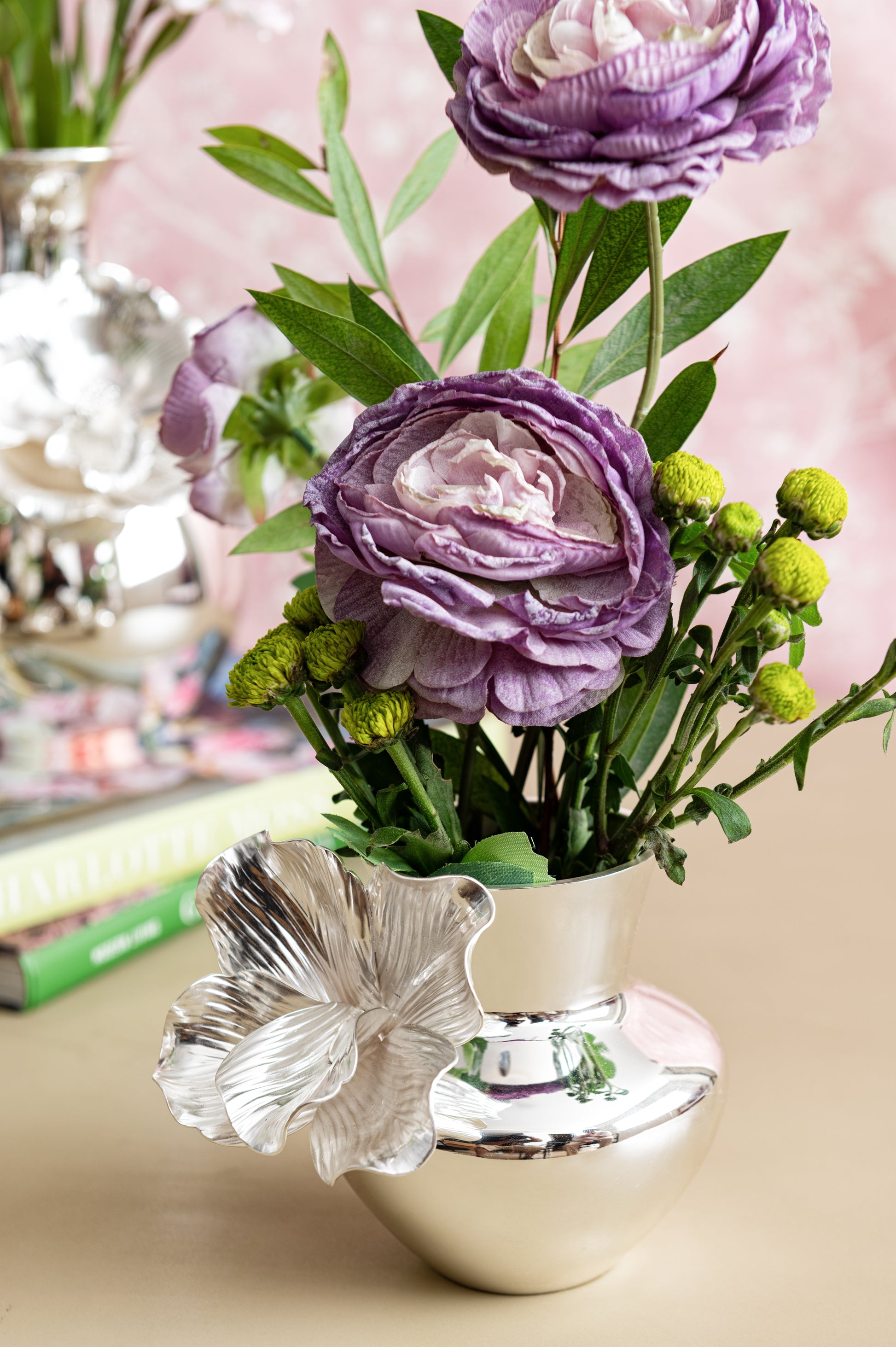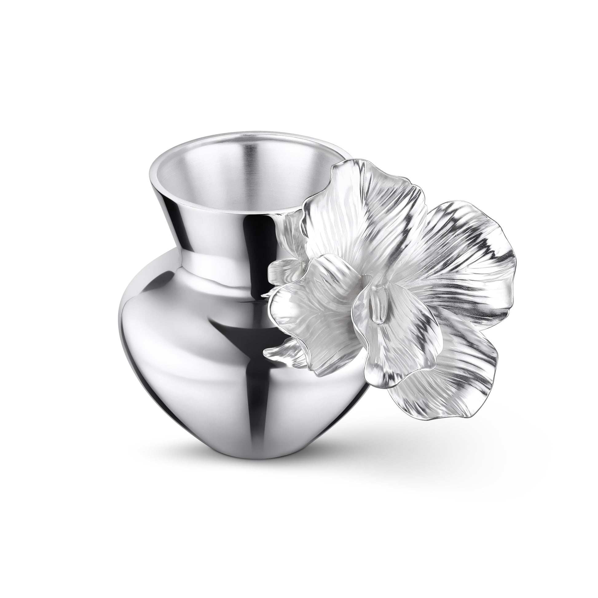 Silver-plated bulb vase with a flared neck and a detailed flower on the side.