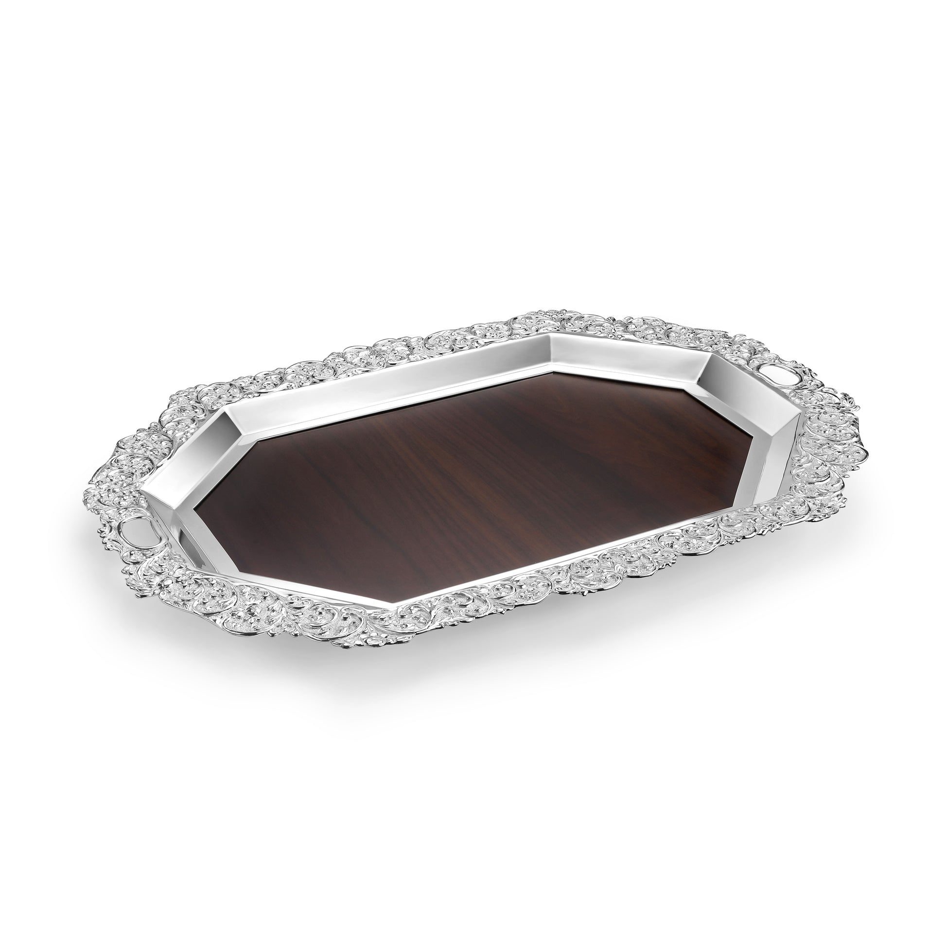 The serving tray features a warm, polished wooden insert framed by a richly embossed silver-plated border.