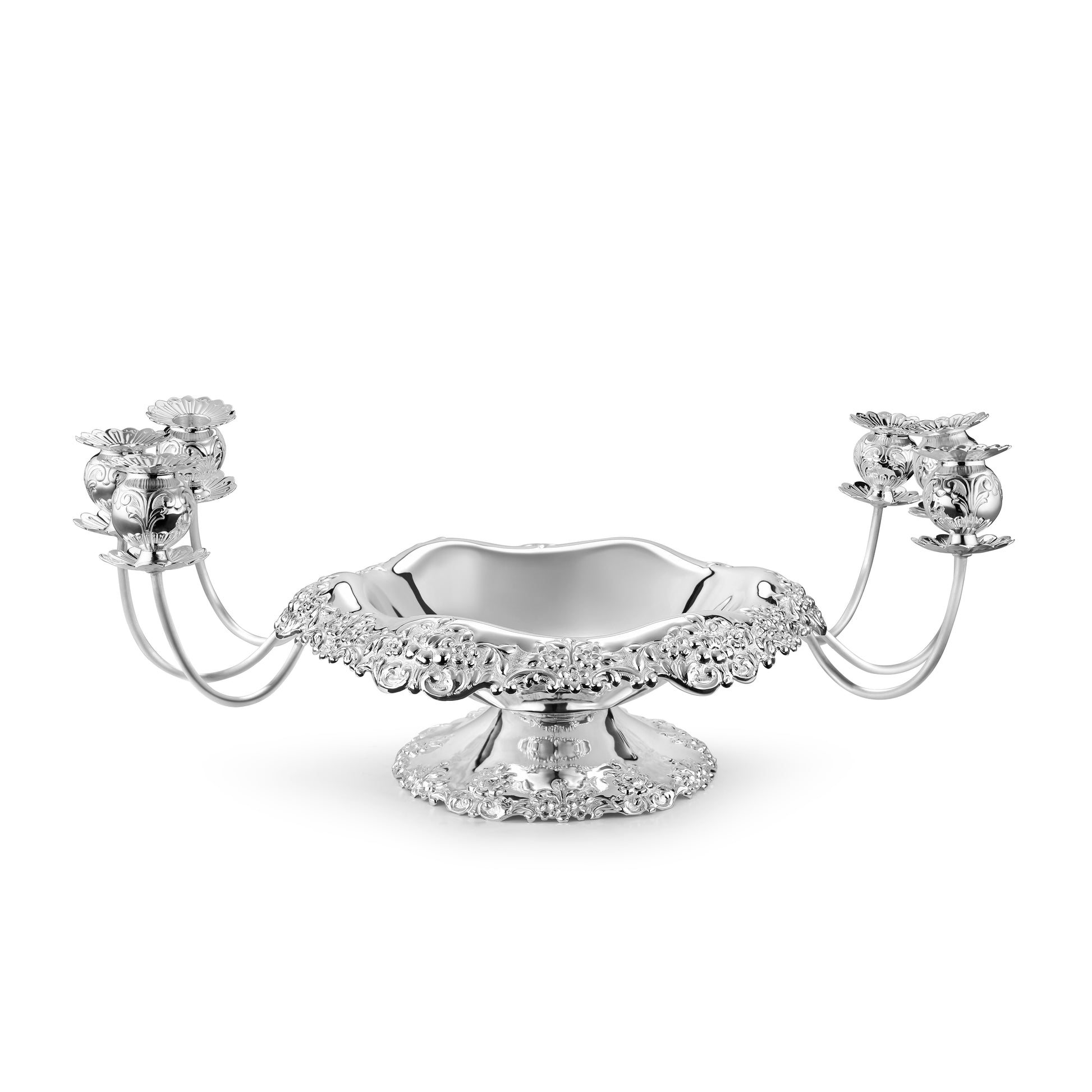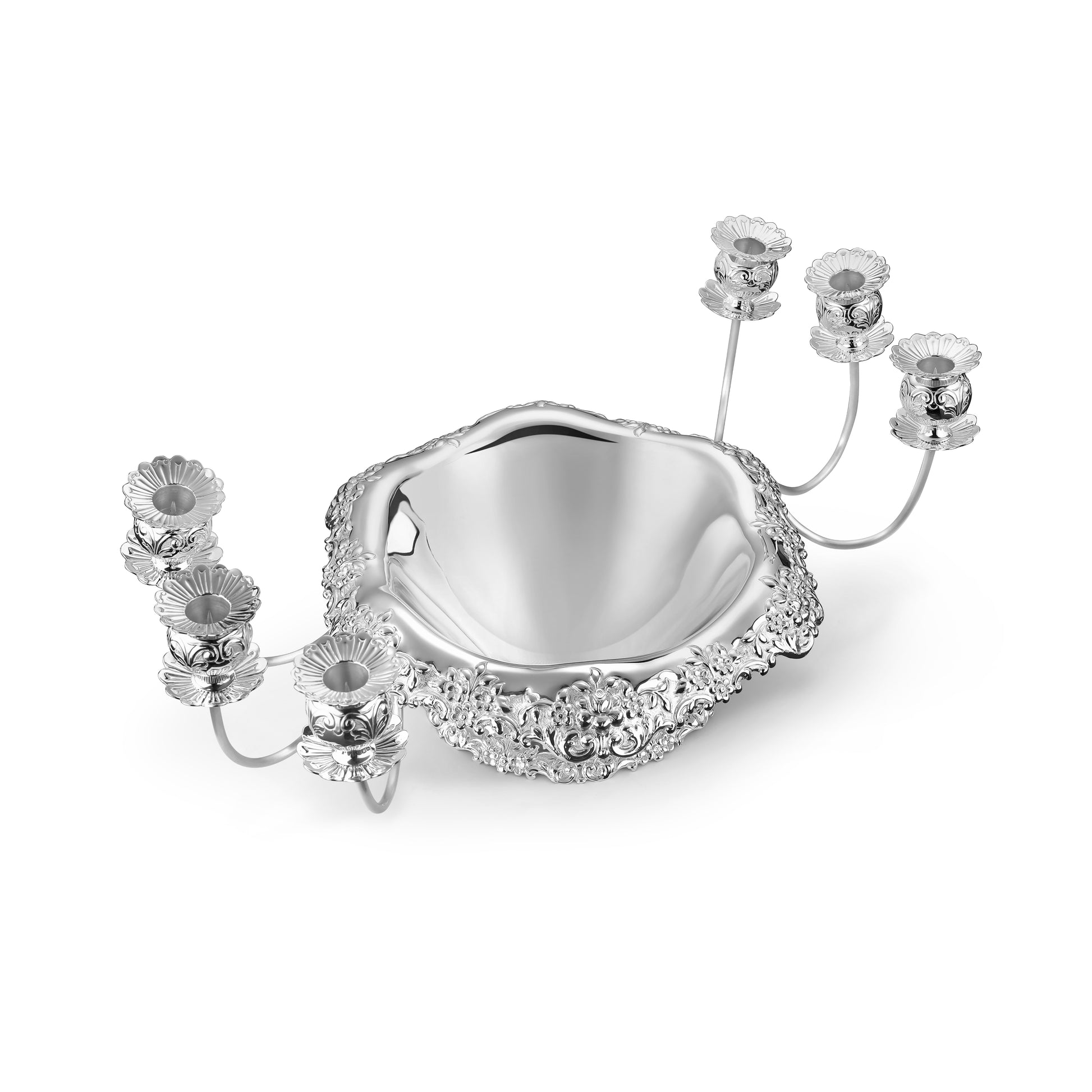 - An ornate silver-plated centerpiece with six gracefully arched arms, each designed to hold a taper candle.